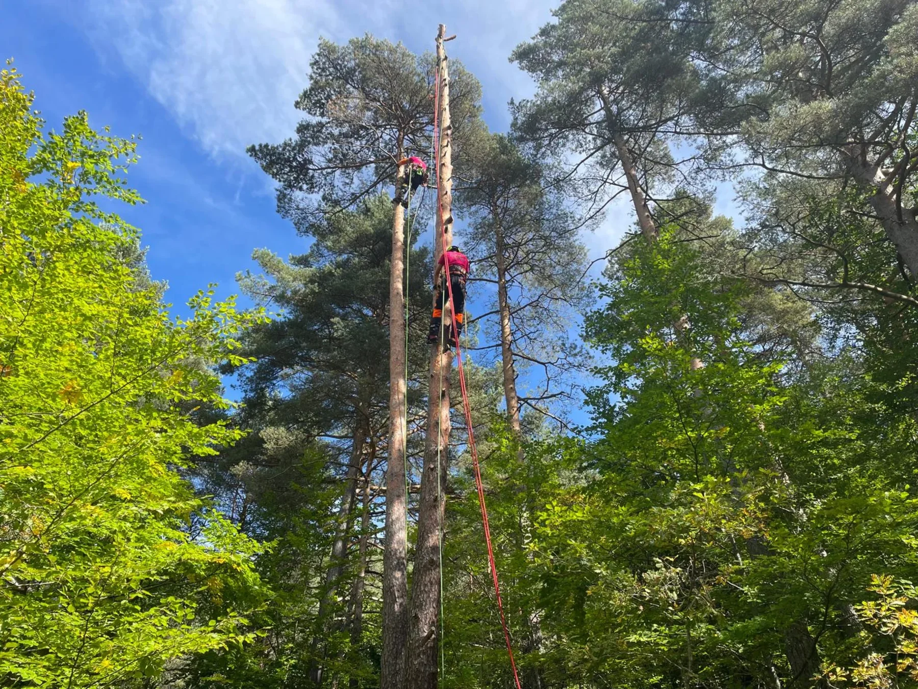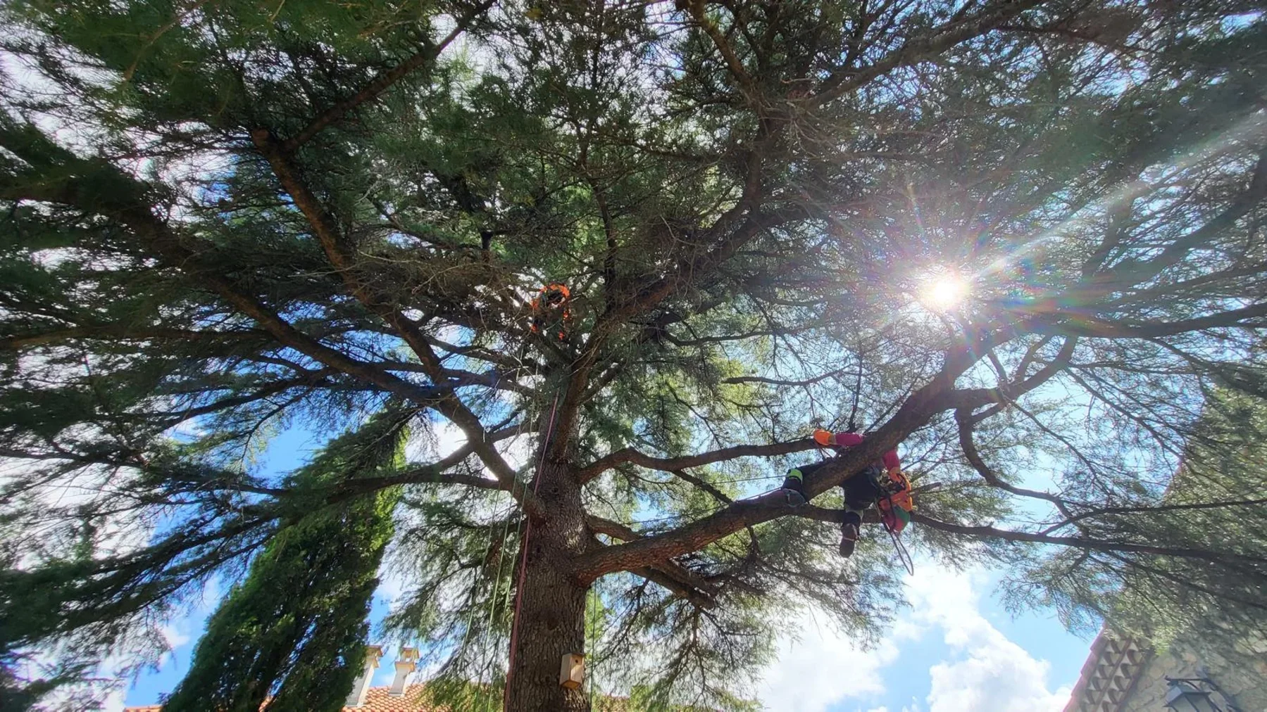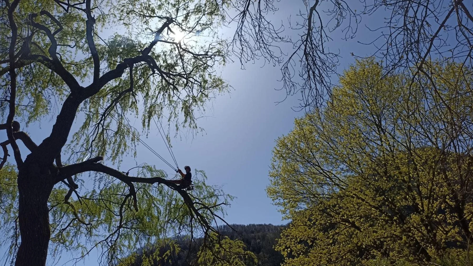 Silhouette d'un élagueur contre le soleil de printemps à Millau Deux grimpeurs-élagueurs dans un cèdre en été près de Millau Démontage d'un sapin en forêt — Mik'Arbre Élagage